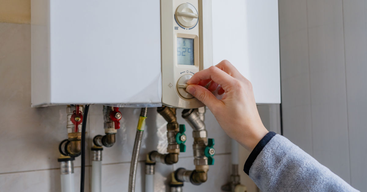 Hand turning the control knob on a white wall-mounted gas boiler, with pipes visible below, representing residential heating systems and everyday energy management at home.